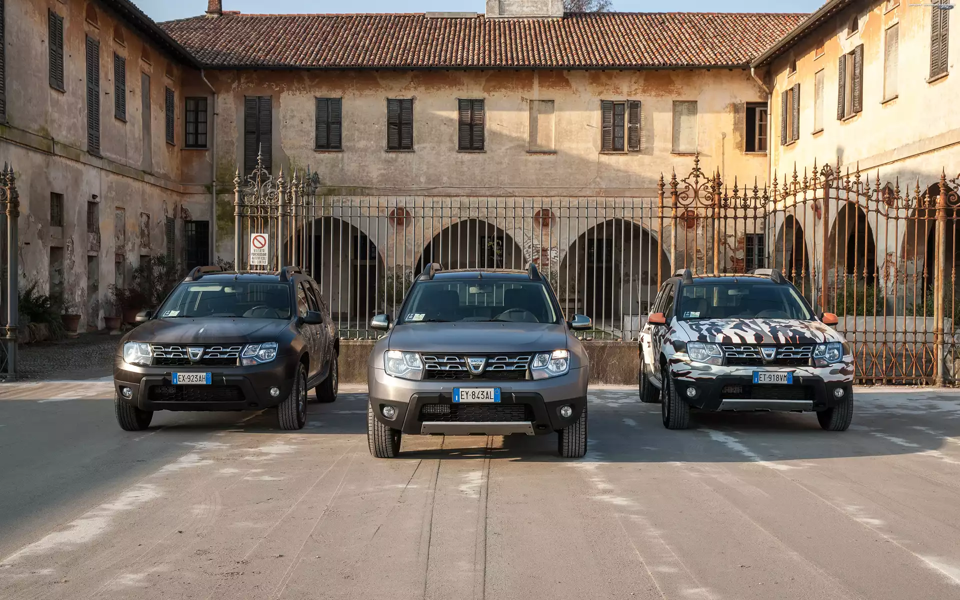 Budynek, Brama, Samochody, Trzy, Dacia Duster I- Zdjęcia samochodów